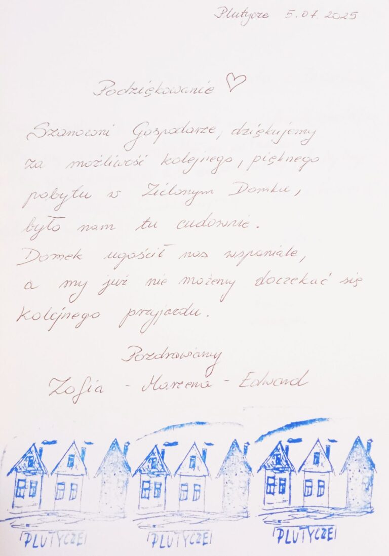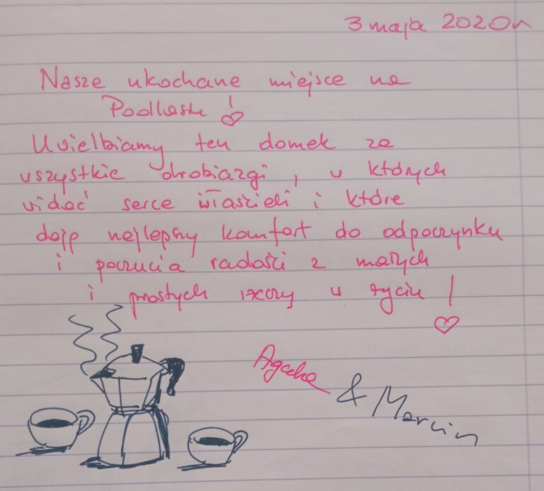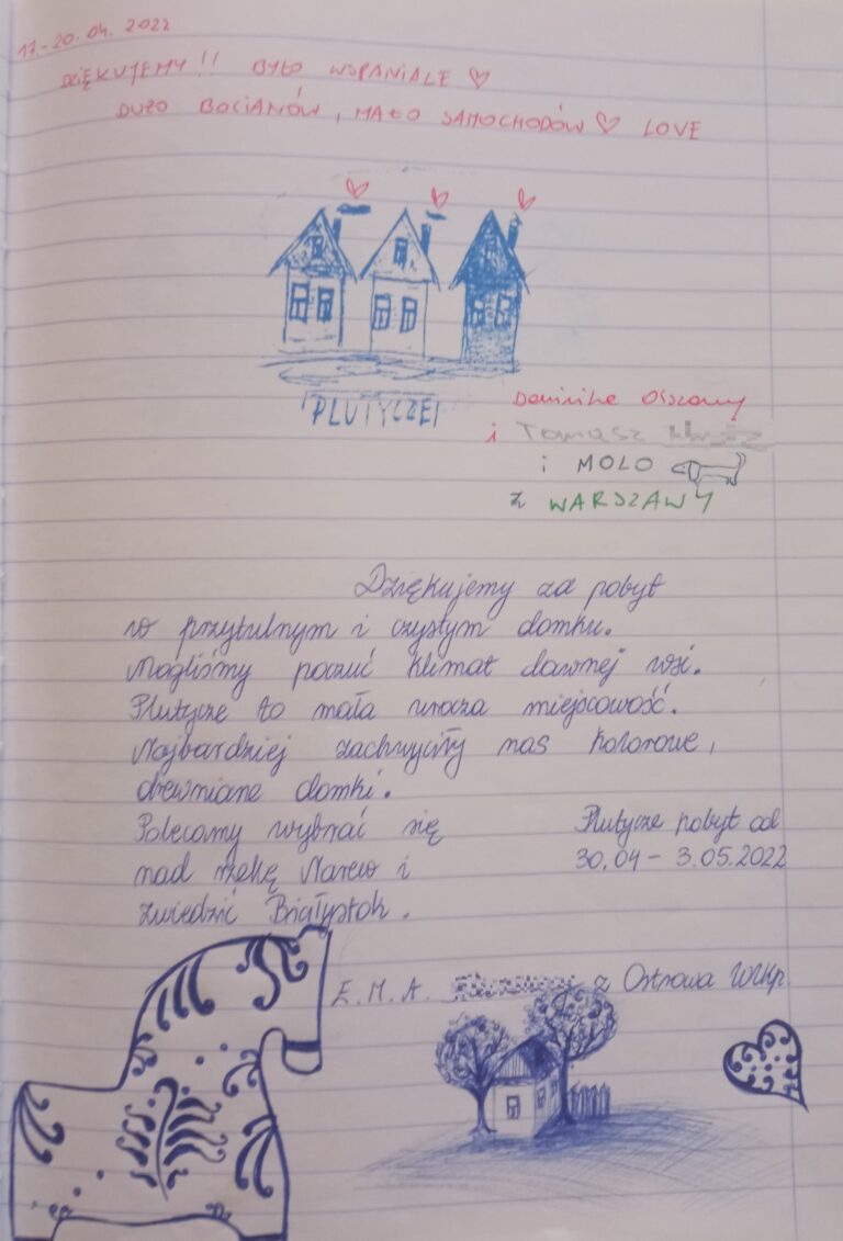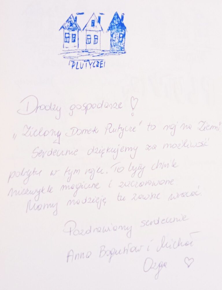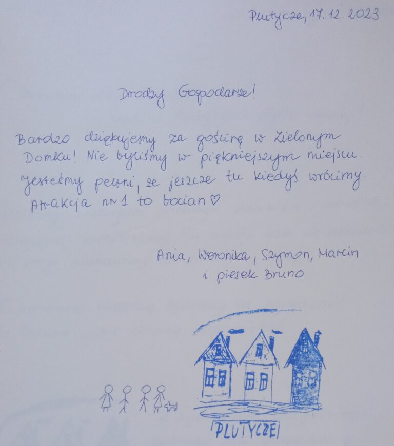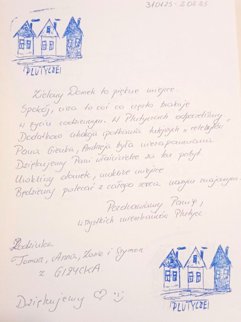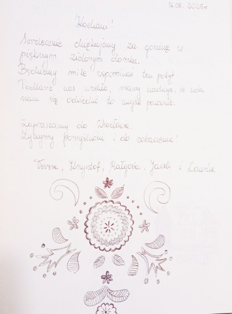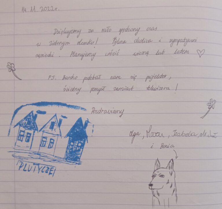 Kiedy rozpoczynaliśmy przygodę z wynajmowaniem Zielonego Domku, założyliśmy Księgę gości. Nie spodziewaliśmy się, że zwykły zeszyt stanie się swego rodzaju kroniką, w której oprócz dat pobytu i kilku grzecznościowych zdań znajdą się Państwa odczucia, wspomnienia i mnóstwo ciepłych słów, kierowanych nie tylko do nas i Zielonego Domku, ale też do naszych sąsiadów, całej wioski, objazdowego sklepu, który zatrzymuje się przed domkiem, a nawet bociana 🙂 Dziękujemy wszystkim naszym Gościom za życzliwość i pozytywną energię, a także za czas, wysiłek, niekiedy wręcz pasję, jakie wkładacie w swoje wpisy i rysunki. Zapraszamy do przeglądania niektórych wpisów poniżej.