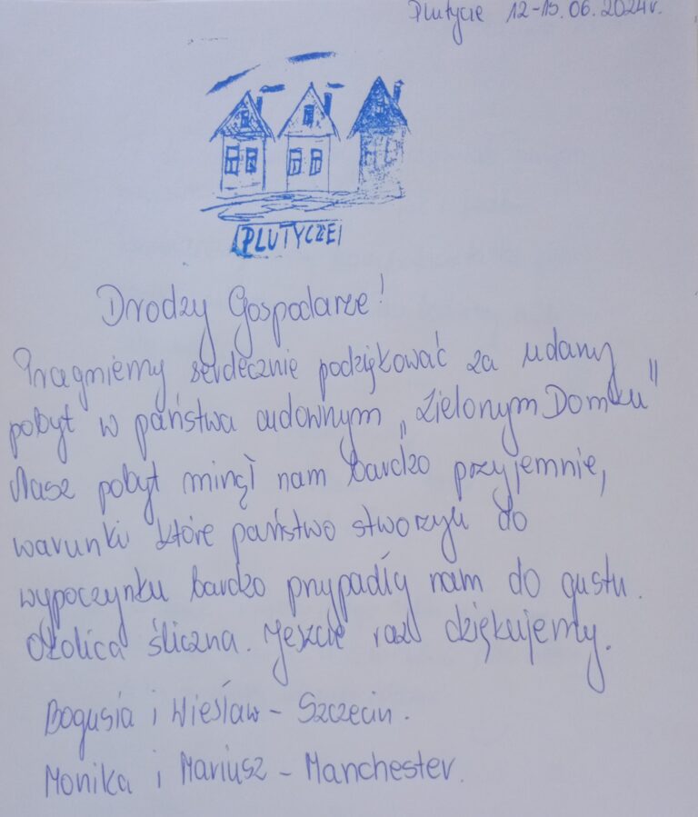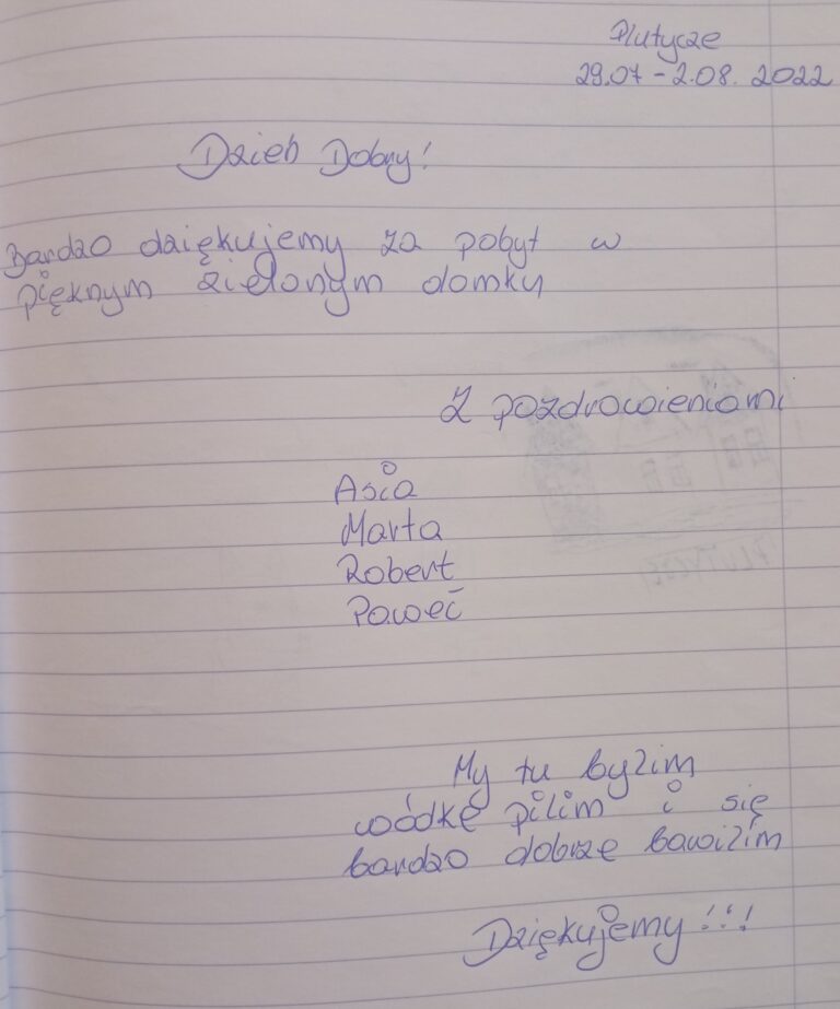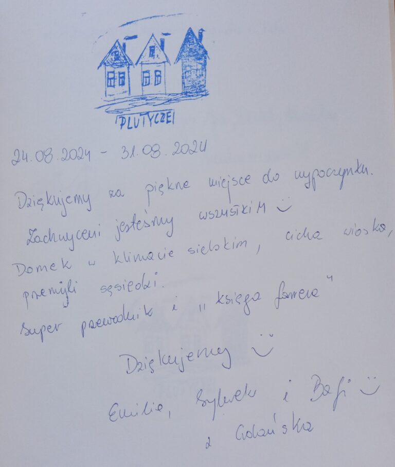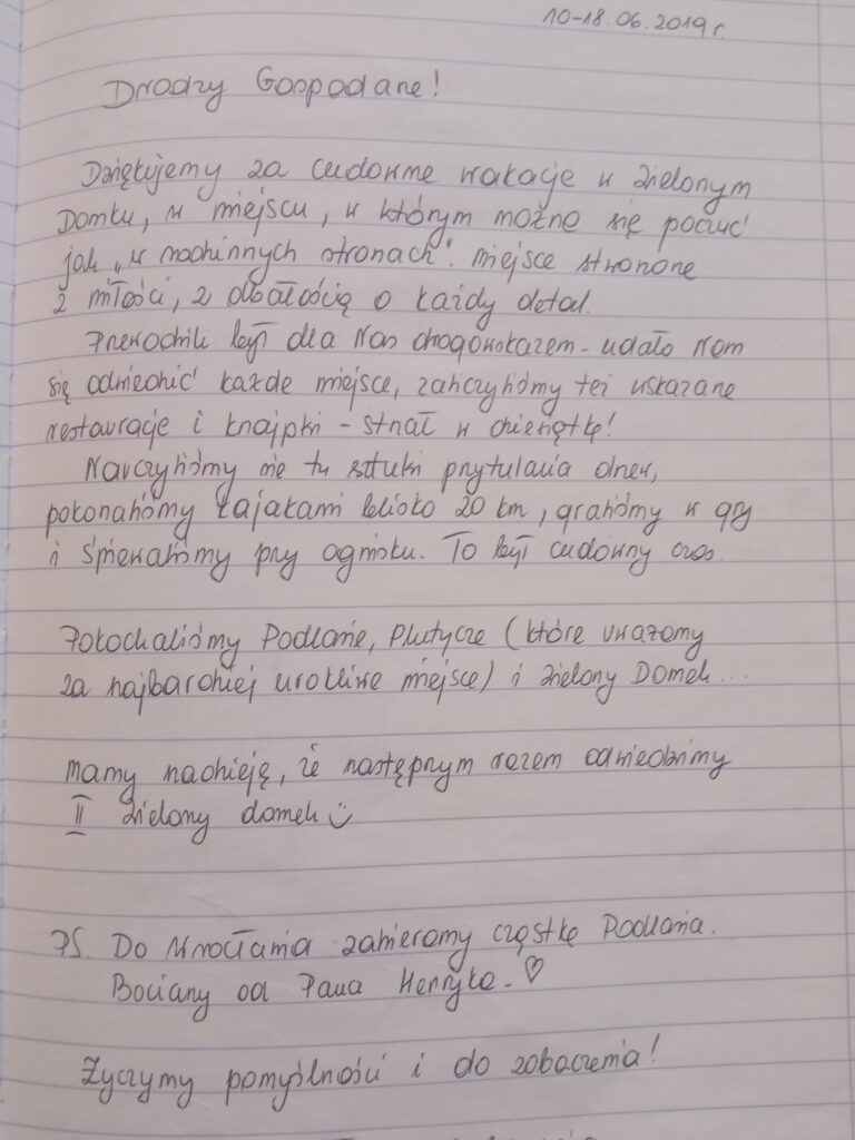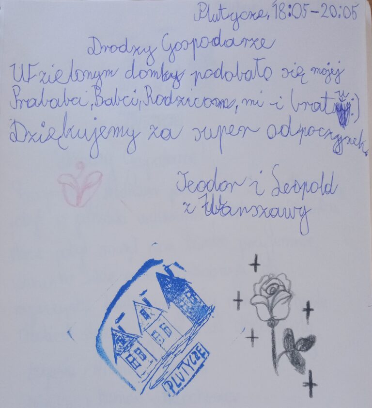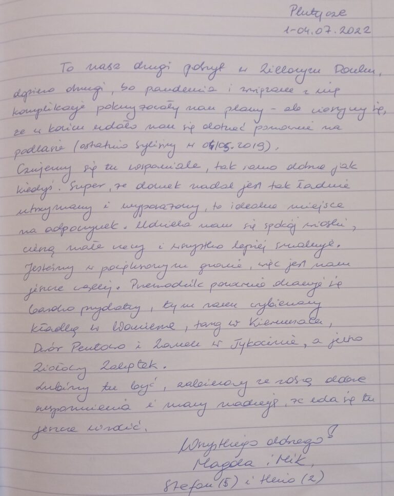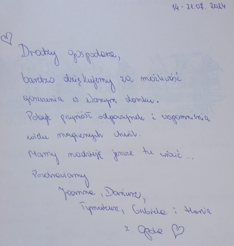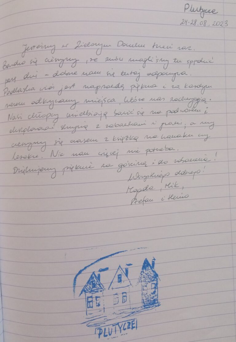 Kiedy rozpoczynaliśmy przygodę z wynajmowaniem Zielonego Domku, założyliśmy Księgę gości. Nie spodziewaliśmy się, że zwykły zeszyt stanie się swego rodzaju kroniką, w której oprócz dat pobytu i kilku grzecznościowych zdań znajdą się Państwa odczucia, wspomnienia i mnóstwo ciepłych słów, kierowanych nie tylko do nas i Zielonego Domku, ale też do naszych sąsiadów, całej wioski, objazdowego sklepu, który zatrzymuje się przed domkiem, a nawet bociana 🙂 Dziękujemy wszystkim naszym Gościom za życzliwość i pozytywną energię, a także za czas, wysiłek, niekiedy wręcz pasję, jakie wkładacie w swoje wpisy i rysunki. Zapraszamy do przeglądania niektórych wpisów poniżej.