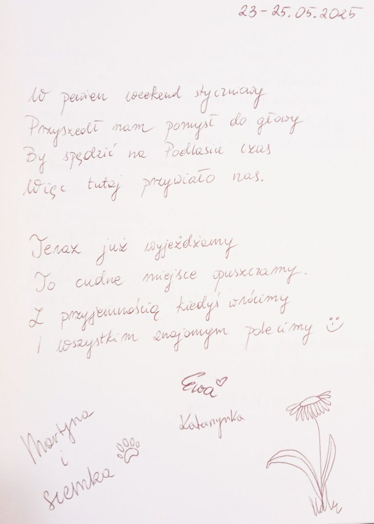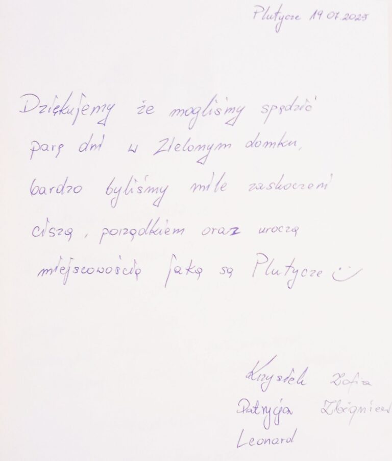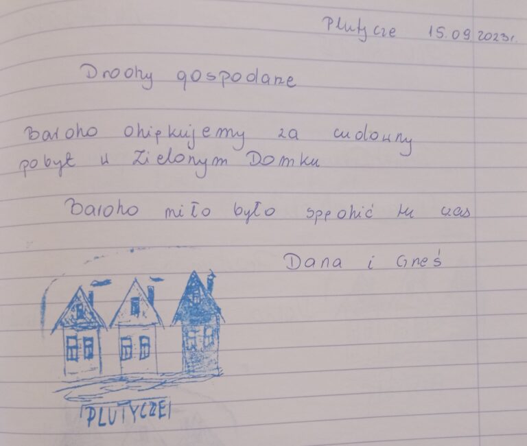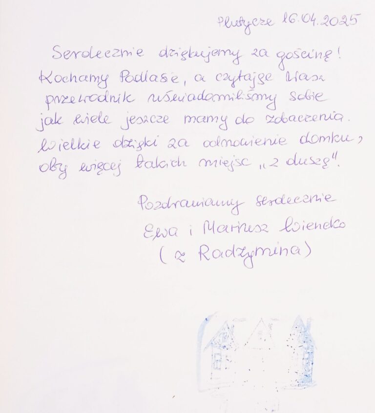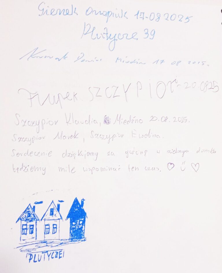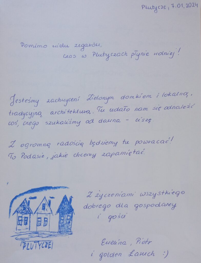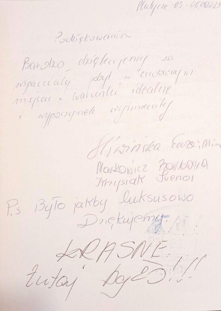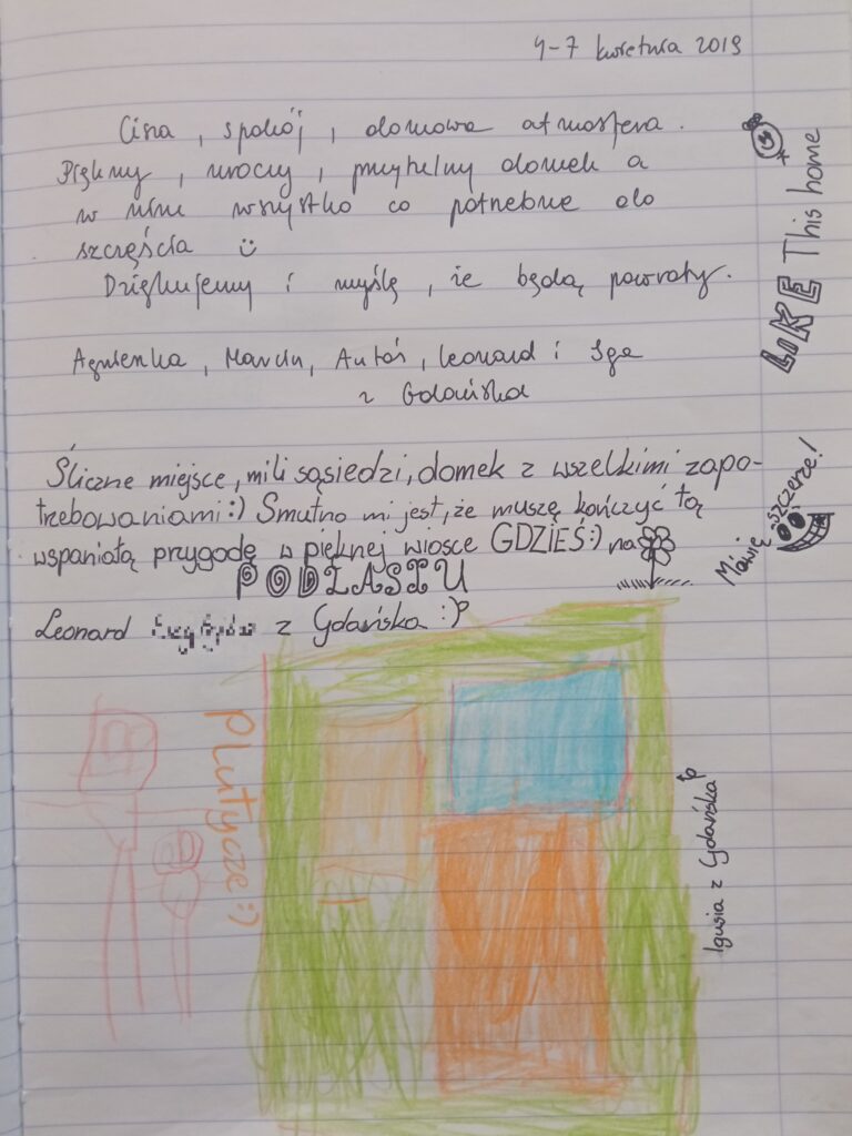 Kiedy rozpoczynaliśmy przygodę z wynajmowaniem Zielonego Domku, założyliśmy Księgę gości. Nie spodziewaliśmy się, że zwykły zeszyt stanie się swego rodzaju kroniką, w której oprócz dat pobytu i kilku grzecznościowych zdań znajdą się Państwa odczucia, wspomnienia i mnóstwo ciepłych słów, kierowanych nie tylko do nas i Zielonego Domku, ale też do naszych sąsiadów, całej wioski, objazdowego sklepu, który zatrzymuje się przed domkiem, a nawet bociana 🙂 Dziękujemy wszystkim naszym Gościom za życzliwość i pozytywną energię, a także za czas, wysiłek, niekiedy wręcz pasję, jakie wkładacie w swoje wpisy i rysunki. Zapraszamy do przeglądania niektórych wpisów poniżej.