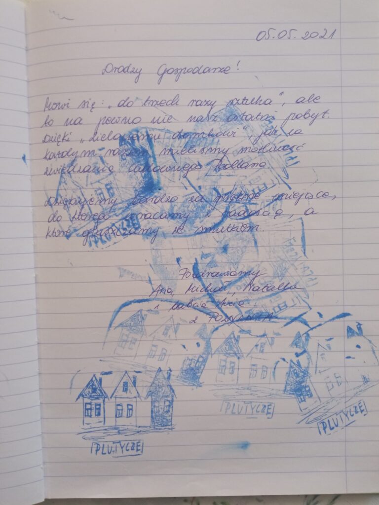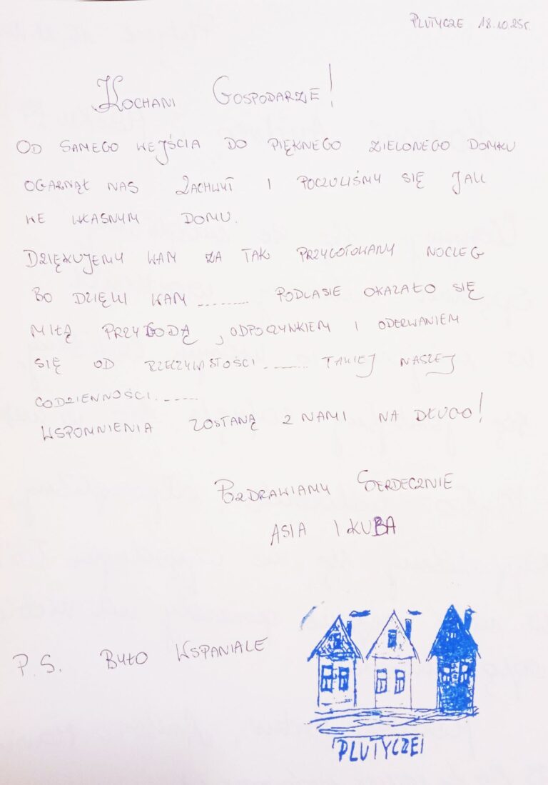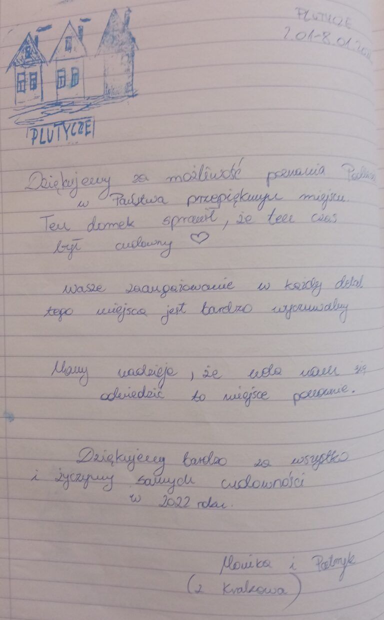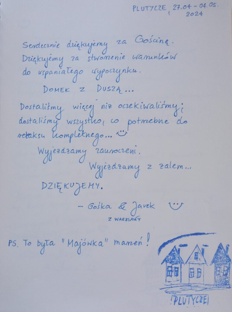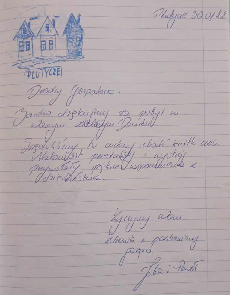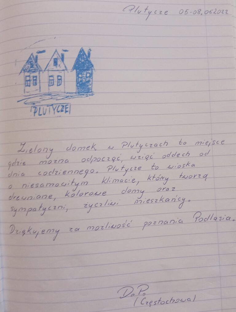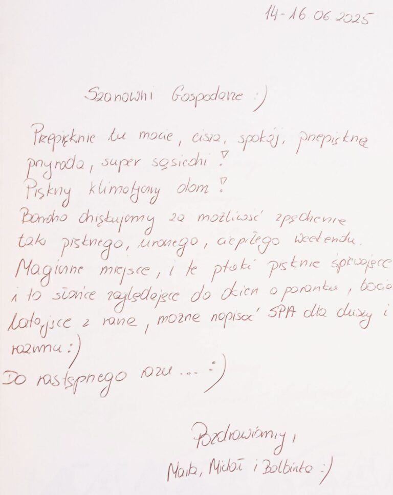 Kiedy rozpoczynaliśmy przygodę z wynajmowaniem Zielonego Domku, założyliśmy Księgę gości. Nie spodziewaliśmy się, że zwykły zeszyt stanie się swego rodzaju kroniką, w której oprócz dat pobytu i kilku grzecznościowych zdań znajdą się Państwa odczucia, wspomnienia i mnóstwo ciepłych słów, kierowanych nie tylko do nas i Zielonego Domku, ale też do naszych sąsiadów, całej wioski, objazdowego sklepu, który zatrzymuje się przed domkiem, a nawet bociana 🙂 Dziękujemy wszystkim naszym Gościom za życzliwość i pozytywną energię, a także za czas, wysiłek, niekiedy wręcz pasję, jakie wkładacie w swoje wpisy i rysunki. Zapraszamy do przeglądania niektórych wpisów poniżej.