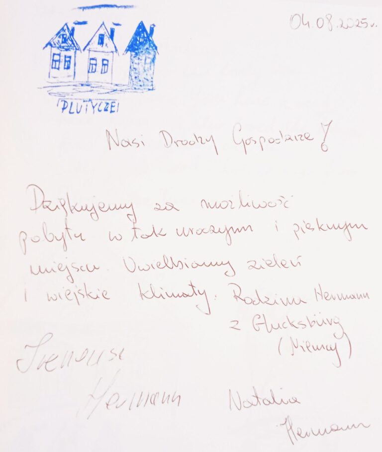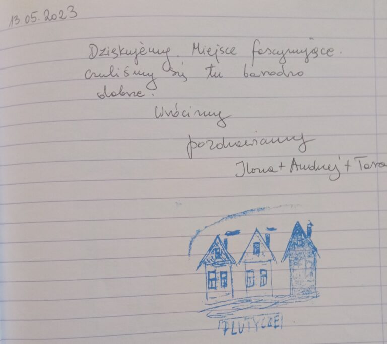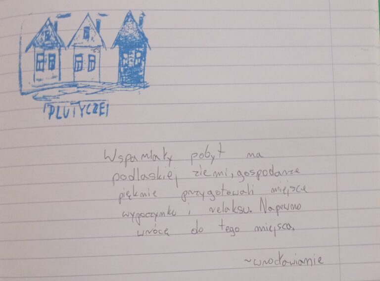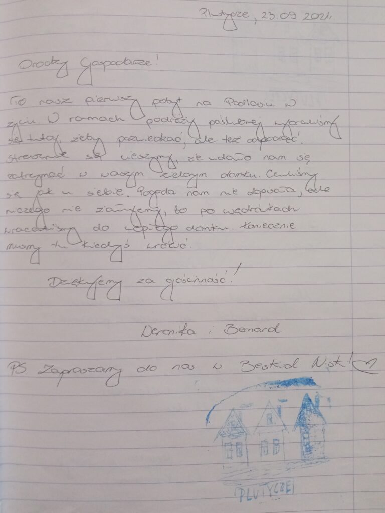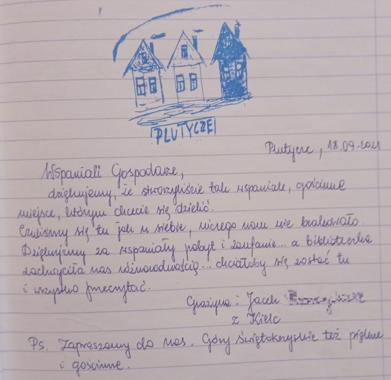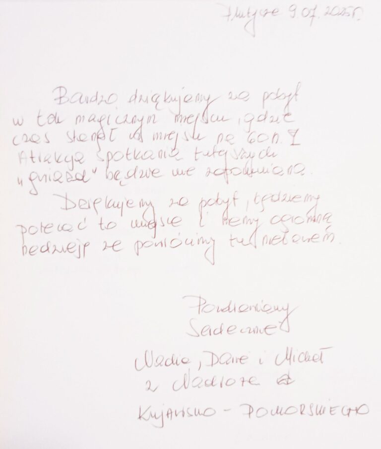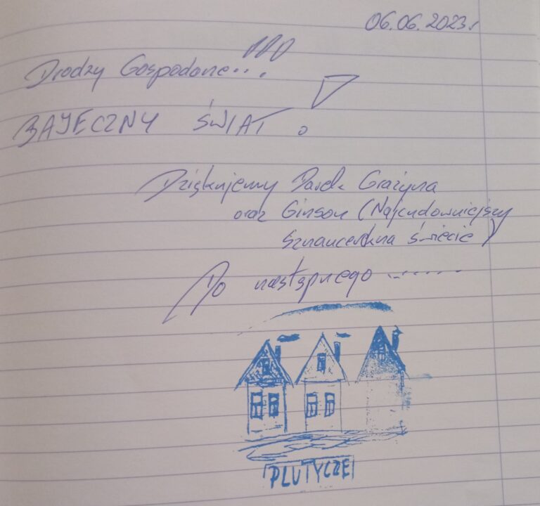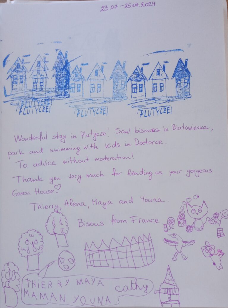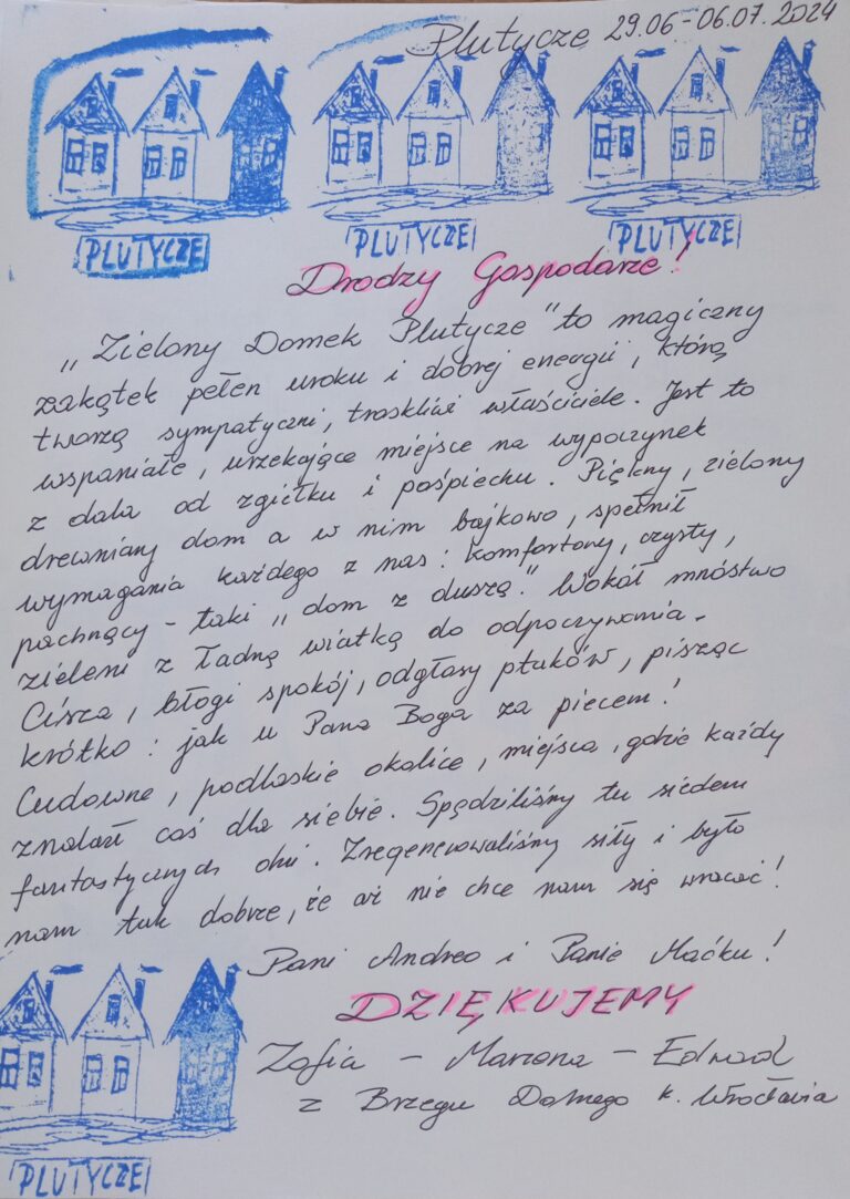 Kiedy rozpoczynaliśmy przygodę z wynajmowaniem Zielonego Domku, założyliśmy Księgę gości. Nie spodziewaliśmy się, że zwykły zeszyt stanie się swego rodzaju kroniką, w której oprócz dat pobytu i kilku grzecznościowych zdań znajdą się Państwa odczucia, wspomnienia i mnóstwo ciepłych słów, kierowanych nie tylko do nas i Zielonego Domku, ale też do naszych sąsiadów, całej wioski, objazdowego sklepu, który zatrzymuje się przed domkiem, a nawet bociana 🙂 Dziękujemy wszystkim naszym Gościom za życzliwość i pozytywną energię, a także za czas, wysiłek, niekiedy wręcz pasję, jakie wkładacie w swoje wpisy i rysunki. Zapraszamy do przeglądania niektórych wpisów poniżej.