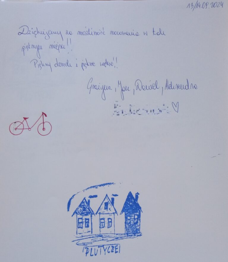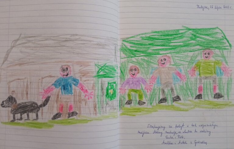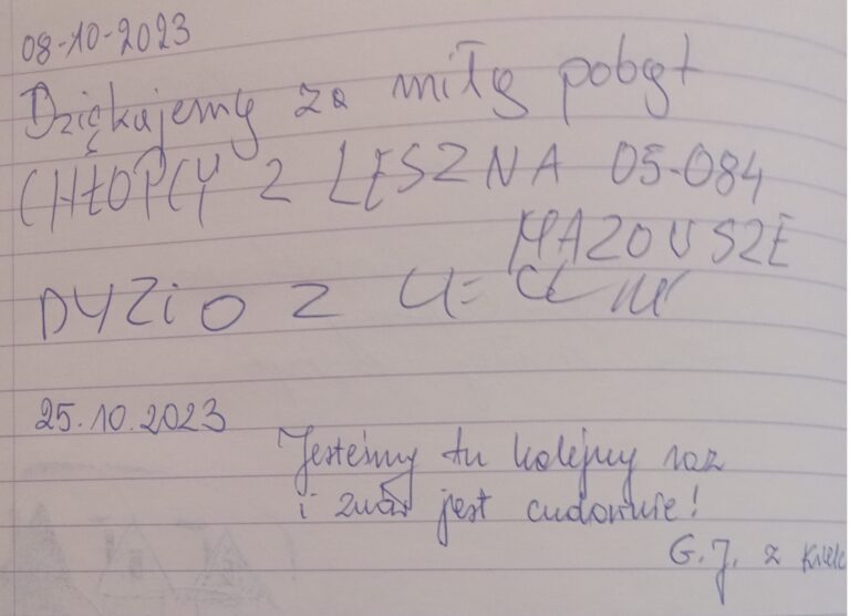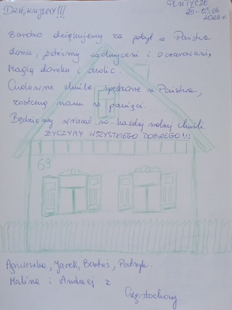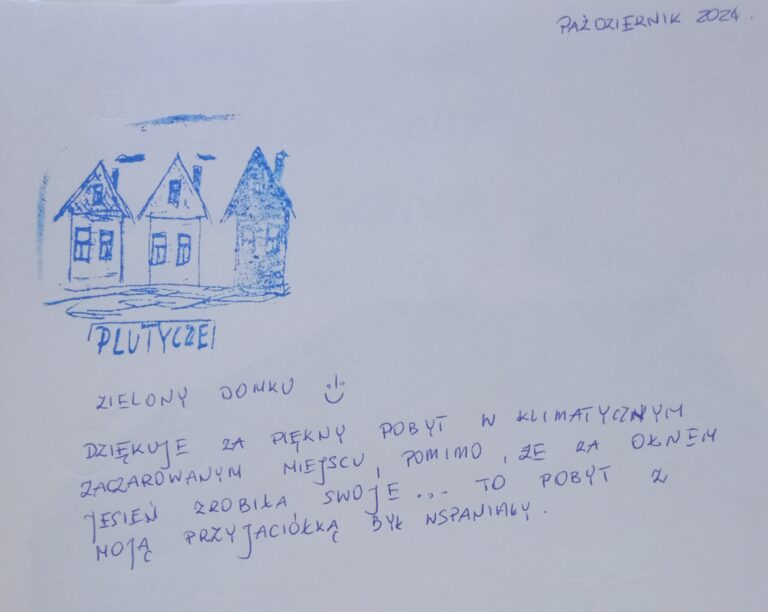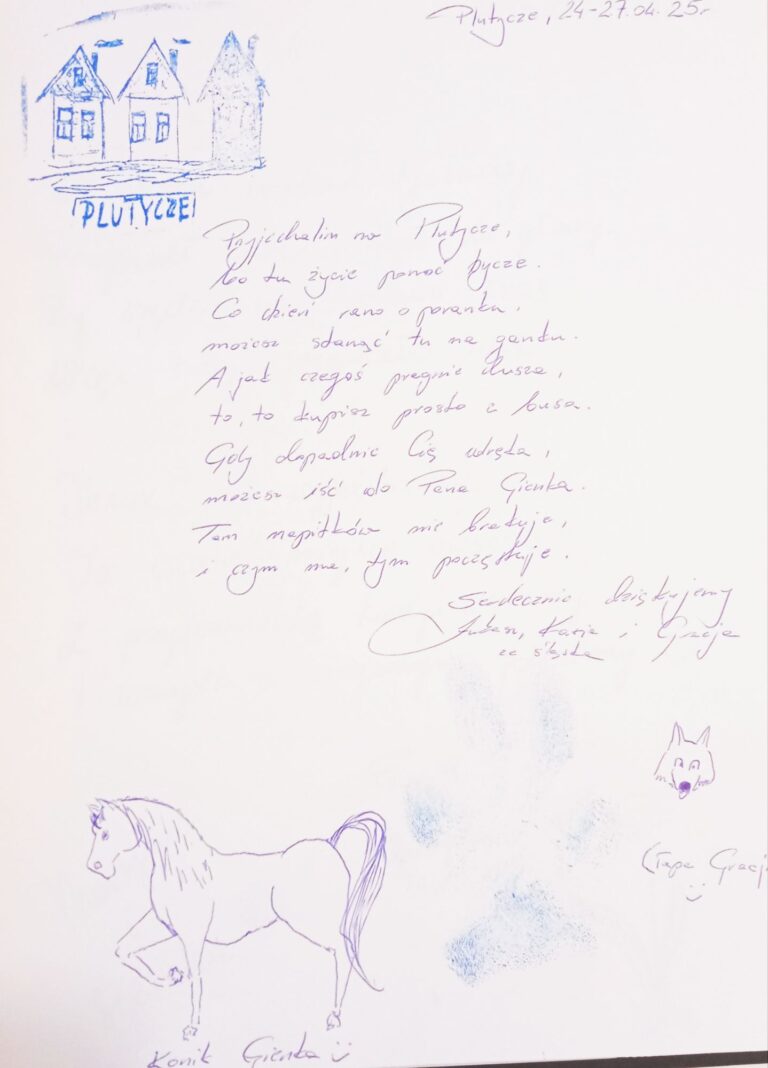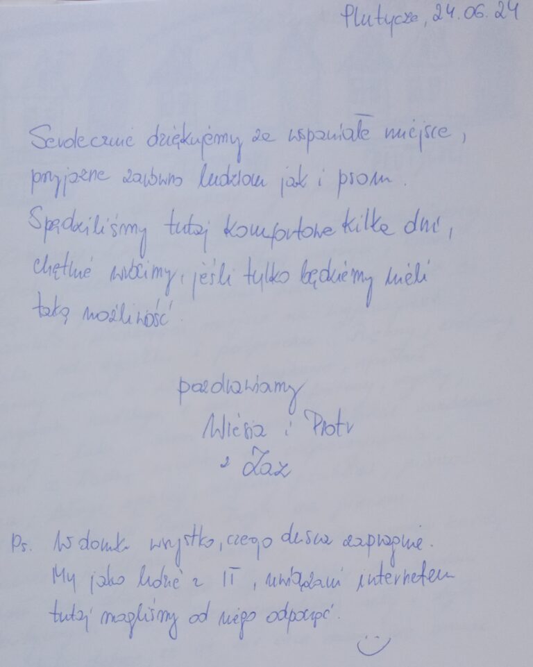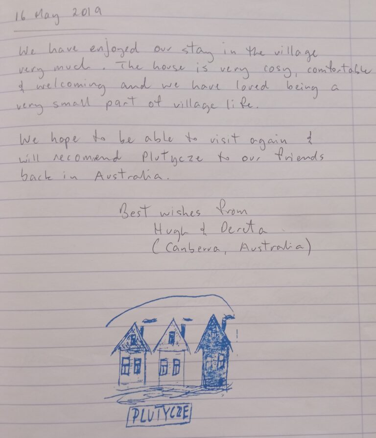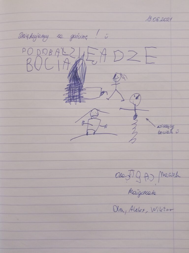 Kiedy rozpoczynaliśmy przygodę z wynajmowaniem Zielonego Domku, założyliśmy Księgę gości. Nie spodziewaliśmy się, że zwykły zeszyt stanie się swego rodzaju kroniką, w której oprócz dat pobytu i kilku grzecznościowych zdań znajdą się Państwa odczucia, wspomnienia i mnóstwo ciepłych słów, kierowanych nie tylko do nas i Zielonego Domku, ale też do naszych sąsiadów, całej wioski, objazdowego sklepu, który zatrzymuje się przed domkiem, a nawet bociana 🙂 Dziękujemy wszystkim naszym Gościom za życzliwość i pozytywną energię, a także za czas, wysiłek, niekiedy wręcz pasję, jakie wkładacie w swoje wpisy i rysunki. Zapraszamy do przeglądania niektórych wpisów poniżej.